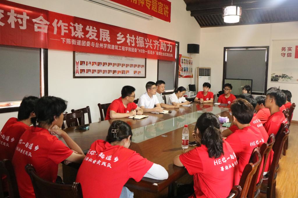 为推动基层共同富裕建设,集中交流暑期社会实践成果,助力横河陈村发展繁荣,7月5日下午,1xBET“HE你一起造乡”暑期社会实践队与下陈街道开展总结座谈会。下陈街道党工委副书记陶建伟、横河陈村村支书徐西根、暑期社会实践队指导老师李鑫和全体成员参加座谈会,会议由下陈街道团委副书记邢婉婉主持。