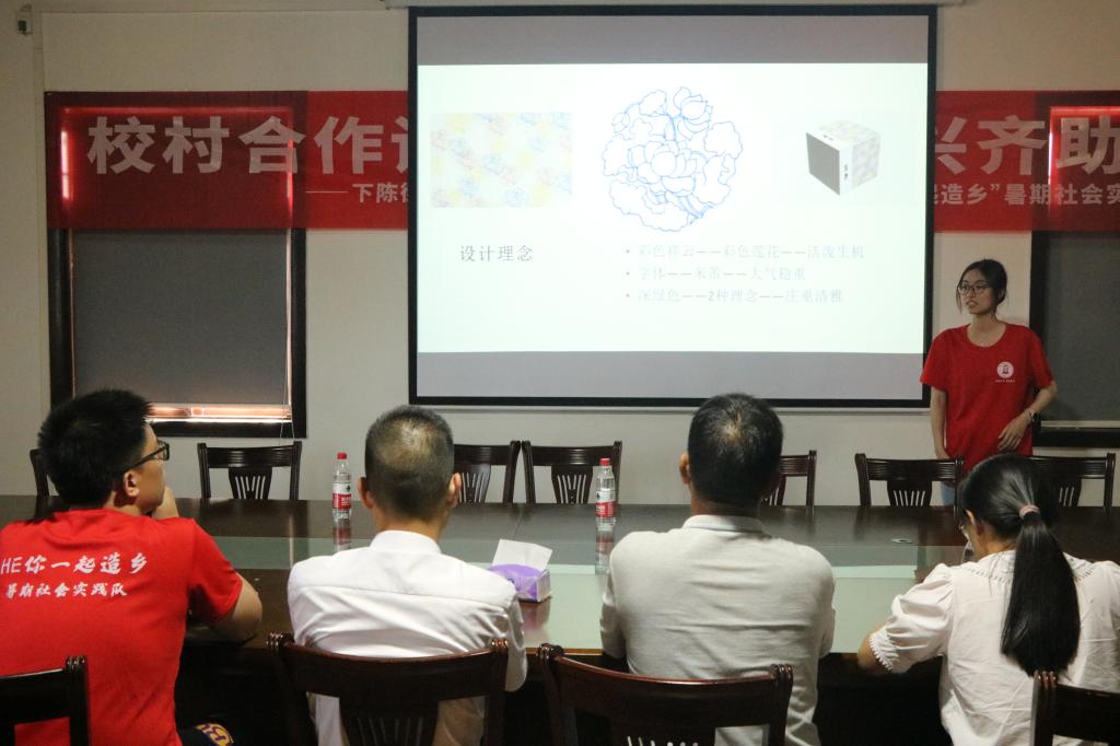 会上,实践队员结合一段时间以来的观察、思考和走访交流情况,就村产业发展类型、村容村貌建设、莲花及周边产品包装设计和乡村主题标识设计等话题进行主题汇报。