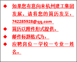 如果您有意向来杭州建工集团发展,请将您的简历发至:742285928@qq.com简历以附件形式提供。邮件标题格式为:应聘岗位—公司—专业—姓名。