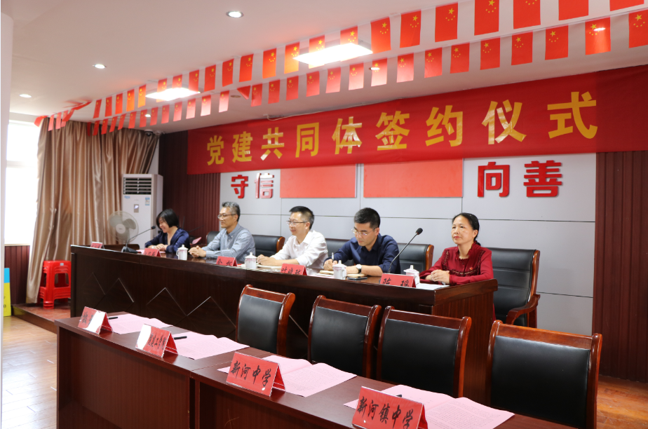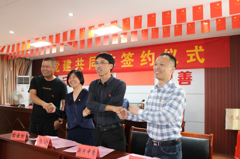 潘岳祥宣读党建共同体协议书,新河镇披云村党总支部书记、1xBET总支部书记、新河中学党委书记、新河镇中学总支部书记进行了“三校一村”的党建共同体签约仪式。