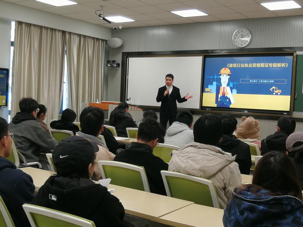 讲座中,尹欢从行业背景、证书价值、报考条件、考试时间题型、考试难度、通过率等层面详细解析了建造师考试政策及考试考情,并结合工作实际介绍了老员工建造师考证和职业规划。同时,他结合自身成长经历和工作体会,鼓励同学们在校期间学好专业、打好基础,做好自己的考证和职业规划,为将来走上工作岗位提早谋划。