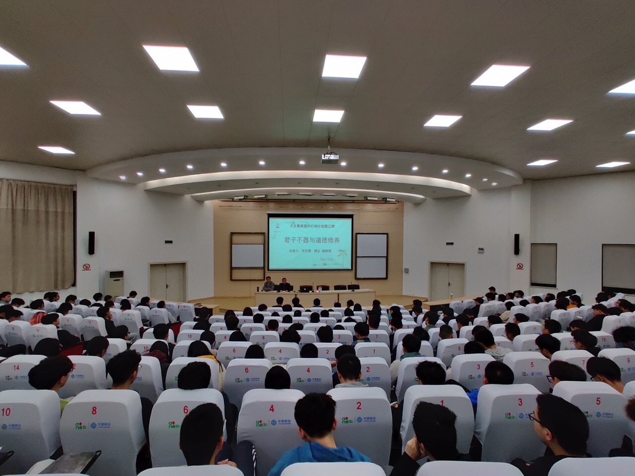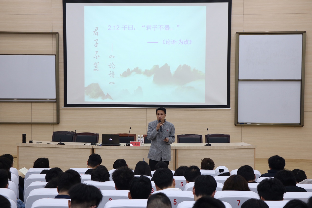 讲座从《论语》中的经典语句“君子不器”一词入手,分析“君子不器”的含义,得出君子是道德的人格化,人人都应该通过道德修养提高自己的精神境界。接着,探讨什么是“道”,什么是“德”,用丰富详实的具体事例,深刻阐述“道”与“德”关系,希望每个人都应该尊道贵德。最后,宇老师指出,道德具有时代性、层次性,每个时代都有不同的道德要求,《论语》中的“修己以敬”“修己以安人”“修己以安百姓”,集中展示道德修养的三个层次,每个人都应该追求道德高线,做一个讲道、立德、知法、守礼的新时代青年。整场讲座,宇老师用通俗易懂的语言,诙谐幽默的风格,生动的案例,让与会同学进一步理解了德是做人做实做学问的基础,也是成功的必经之路。
