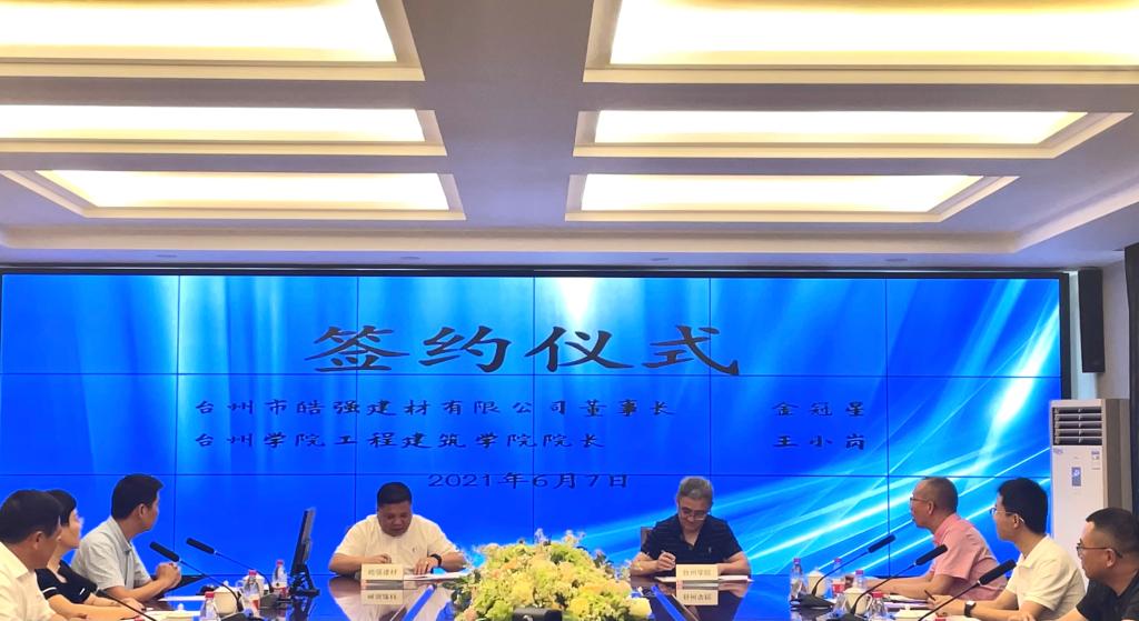 在各方见证下,皓强建材公司金冠星董事长与王小岗经理签订校企合作协议,并与胡忠志博士签订工作室研究协议,台州湾新区管委会相关部门领导和公司领导先后向皓强建材授牌。