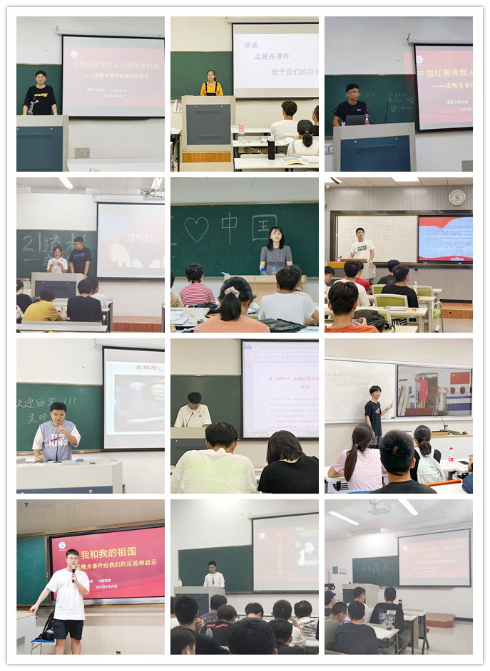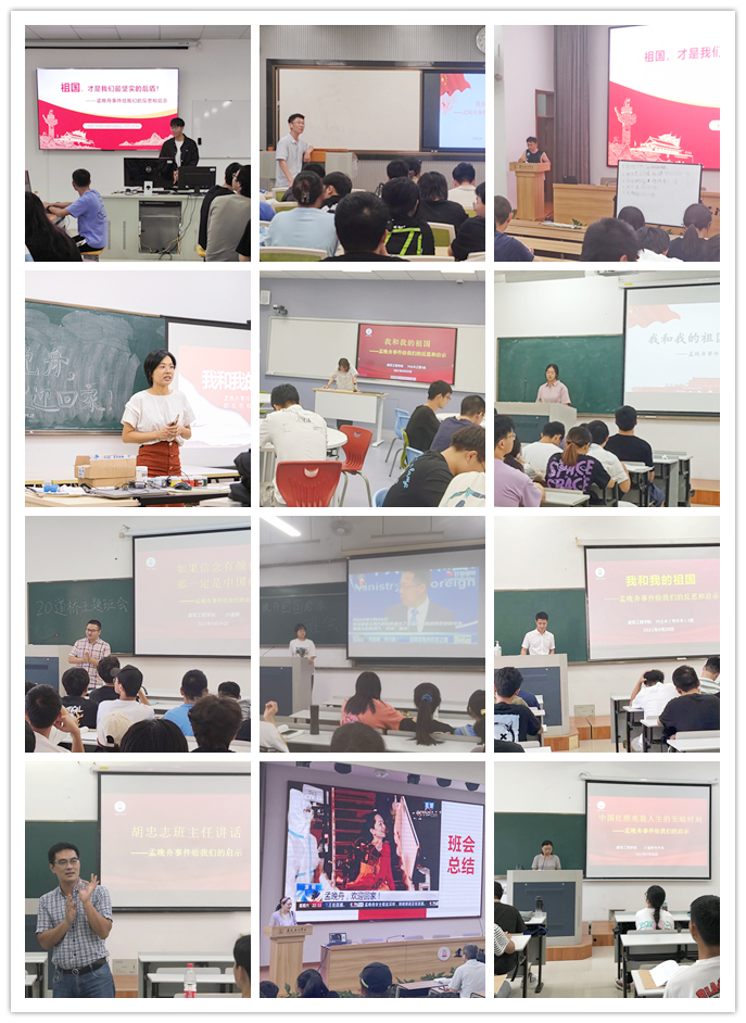 孟晚舟事件是加强师生爱国主义教育、社会主义核心价值观教育、励志教育、奋斗精神教育、专业成才教育的生动教材。通过召开主题班会,建工师生接受了一次思想精神的洗礼,进一步激励大家的家国情怀,感受祖国的日益强大,坚定中华民族伟大复兴的中国梦一定能实现,坚信没有任何力量能够阻挡中国前进的步伐。