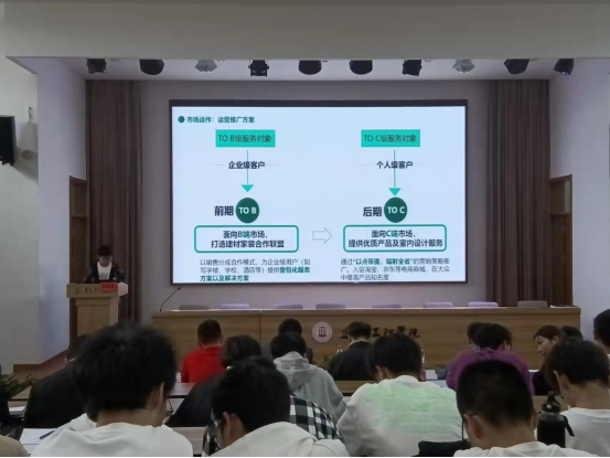 本届院赛共有47个项目、250余名同学自主参加,经公司创新创业委员会初评,23个项目进入会评环节。会上,各项目团队从项目背景、项目内容、市场分析、项目优势及创业风险等方面进行PPT汇报,项目内容涉及室内“绿化”、绿色建筑、垃圾分离、自主租赁、助农服务等多个领域。答辩环节,评委老师对各团队的创新想法给予肯定和鼓励,同时,老师们从项目前期调研、市场前景以及汇报需注意的问题等方面提出了指导性的意见。