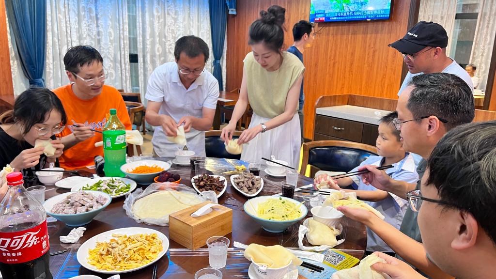 闰六月的初夏,校园内绿风冉冉,草木葱茏。下午三时,校园健步走活动拉开帷幕。大家漫步校园绿道,欢声笑语撒满沿途,在享受美好时光和清新空气的同时,陶冶情操,锻炼身体。之后,在公司教工食堂举行包食饼筒活动。食饼筒是台州特色美食,也是端午佳节台州家家户户必备的传统饮食。食饼筒包法看似简单,实则容易“露馅、断裂”,台州籍老师们纷纷主动担当“指导教师”,为大家指点包法,忙的不亦乐乎。