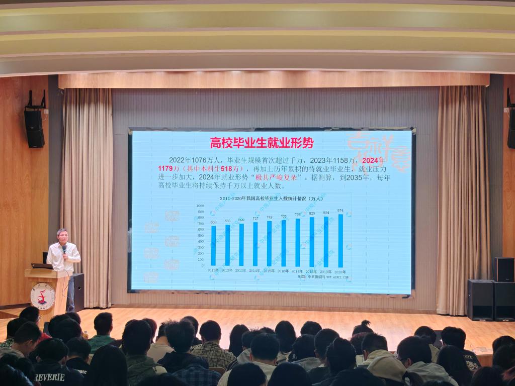 接着,林霖以《攻坚克难:扬帆起航再出发》为题寄语全体毕业生。他强调,2024年就业形势非常严峻,房地产、建筑业进入了“寒冬”,就业如何破局出圈?要聚焦重新认识自我,深刻分析我到底要干什么,我实际能干什么,我为什么干;要聚焦就业影响分析,把握自己能掌控的,借智借力能影响的,乐观心态看待不可控的;要聚焦就业认知改变,先就业、后择业,先生存、后发展,先蓄力、后发力;要聚焦职业素养培养,提升工作境界,掌握职场逻辑,恪守职业行为;要聚焦毕业要求,缺什么补什么、干什么学什么、该做什么不该做什么。辅导员从实操层面具体介绍了就业工作注意事项及留台的有关政策。
