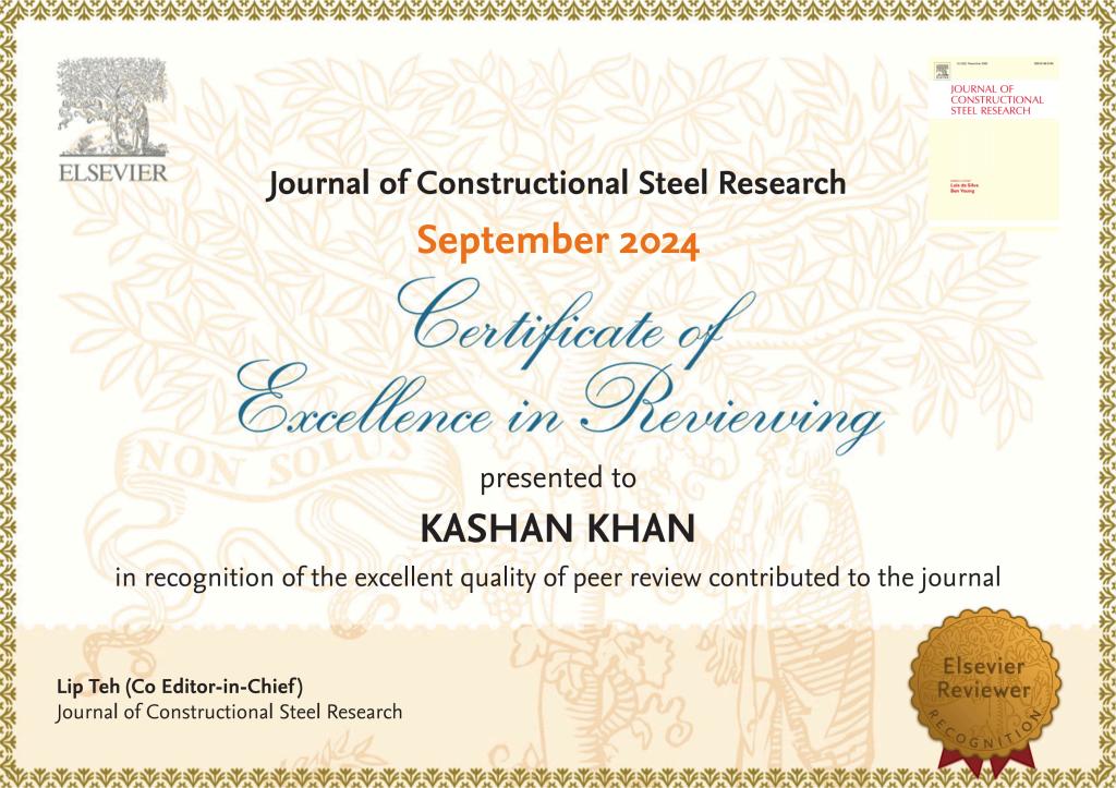 《Journal of Constructional Steel Research》期刊“最佳审稿专家”荣誉证书