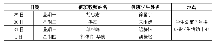 备注:1.为深入实施“大思政”理念下公司“三全育人”体系的构建和实践,推进“思政工作进公寓、学业指导在公寓”工作,本学期继续开展“教师进公寓工程”,即每周一至周四晚(19:00——21:00)安排一名教师进公寓,节假日不安排,教师可结合自己联系寝室、授课员工,通过个别谈心谈话、集体交流座谈等形式加强对员工的生活指导、学习指导、职业生涯指导、就业创业指导、心理健康指导等,满足员工成长需求。2.“教师进公寓工程”由公司学工线牵头,教师安排之日如临时有事,请做好与学工线联络工作或和其他老师调换下公寓时间安排。3.教师公寓联络人李鑫老师,组织做好值班、填写发布每周安排表、联系下公寓教师,并做好相关记录、拍照等。教师交流结束后,请自行做好相关表格登记(值班员工做好提醒)。