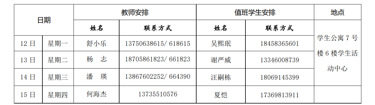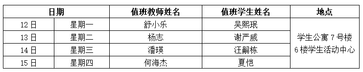 备注:1.为深入实施“大思政”理念下公司“三全育人”体系的构建和实践,推进“思政工作进公寓、学业指导在公寓”工作,本学期继续开展“教师进公寓工程”,即每周一至周四晚(19:00——21:00)安排一名教师进公寓,节假日不安排,教师可结合自己联系寝室、授课员工,通过个别谈心谈话、集体交流座谈等形式加强对员工的生活指导、学习指导、职业生涯指导、就业创业指导、心理健康指导等,满足员工成长需求。2.“教师进公寓工程”由公司学工线牵头,教师安排之日如临时有事,请做好与学工线联络工作或和其他老师调换下公寓时间安排。3.教师公寓联络人李鑫老师,组织做好值班、填写发布每周安排表、联系下公寓教师,并做好相关记录、拍照等。教师交流结束后,请自行做好相关表格登记(值班员工做好提醒)。
