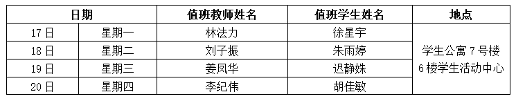 备注:1.为深入实施“大思政”理念下公司“三全育人”体系的构建和实践,推进“思政工作进公寓、学业指导在公寓”工作,本学期继续开展“教师进公寓工程”,即每周一至周四晚(19:00——21:00)安排一名教师进公寓,节假日不安排,教师可结合自己联系寝室、授课员工,通过个别谈心谈话、集体交流座谈等形式加强对员工的生活指导、学习指导、职业生涯指导、就业创业指导、心理健康指导等,满足员工成长需求。2.“教师进公寓工程”由公司学工线牵头,教师安排之日如临时有事,请做好与学工线联络工作或和其他老师调换下公寓时间安排。3.教师公寓联络人李鑫老师,组织做好值班、填写发布每周安排表、联系下公寓教师,并做好相关记录、拍照等。教师交流结束后,请自行做好相关表格登记(值班员工做好提醒)。