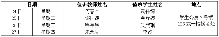 备注:1.为深入实施“大思政”理念下公司“三全育人”体系的构建和实践,推进“思政工作进公寓、学业指导在公寓”工作,本学期继续开展“教师进公寓工程”,即每周一至周四晚(19:00——21:00)安排一名教师进公寓,节假日不安排,教师可结合自己联系寝室、授课员工,通过个别谈心谈话、集体交流座谈等形式加强对员工的生活指导、学习指导、职业生涯指导、就业创业指导、心理健康指导等,满足员工成长需求。2.“教师进公寓工程”由公司学工线牵头,教师安排之日如临时有事,请做好与学工线联络工作或和其他老师调换下公寓时间安排。3.教师公寓联络人李鑫老师,组织做好值班、填写发布每周安排表、联系下公寓教师,并做好相关记录、拍照等。教师交流结束后,请自行做好相关表格登记(值班员工做好提醒)。