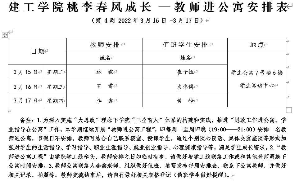 公司桃李春风成长—教师进公寓安排表(第4周 2022年3月15日-3月17日)