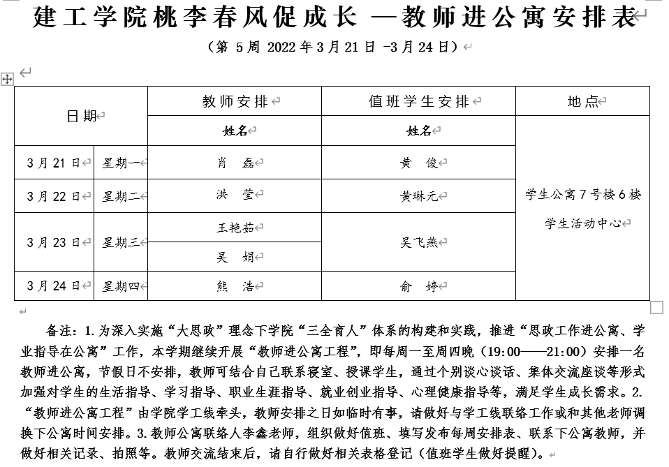 公司桃李春风促成长—教师进公寓安排表(第5周 2022年3月21日-3月24日)