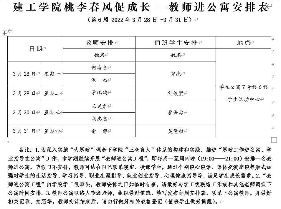 公司桃李春风促成长—教师进公寓安排表(第6周2022年3月28日-3月31日)