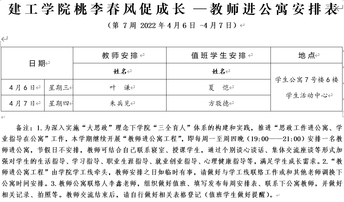公司桃李春风促成长—教师进公寓安排表(第7周 2022年4月6日-4月7日)