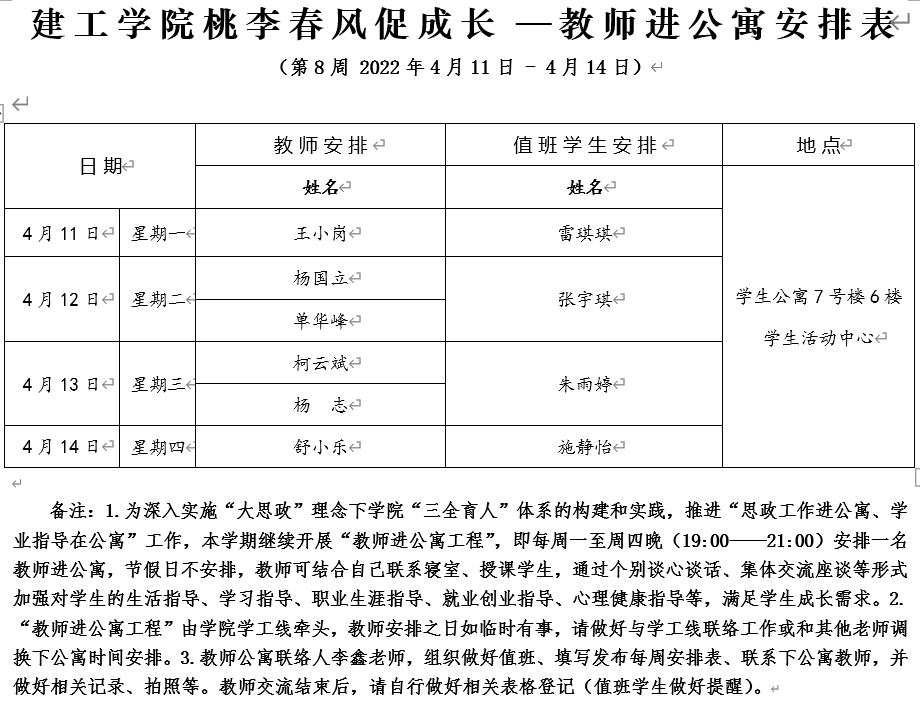 公司桃李春风促成长—教师进公寓安排表(第8周 2022年4月11日-4月14日)
