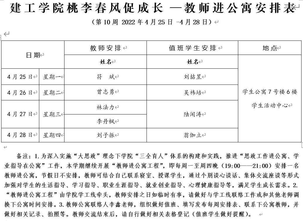 公司桃李春风促成长—教师进公寓安排表(第10周 2022年4月25日-4月28日)