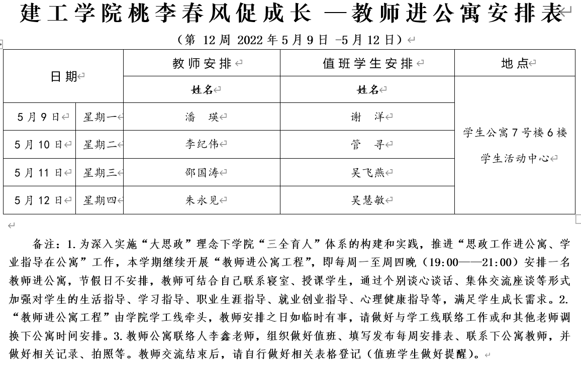 公司桃李春风促成长—教师进公寓安排表(第12周 2022年5月9日-5月12日)