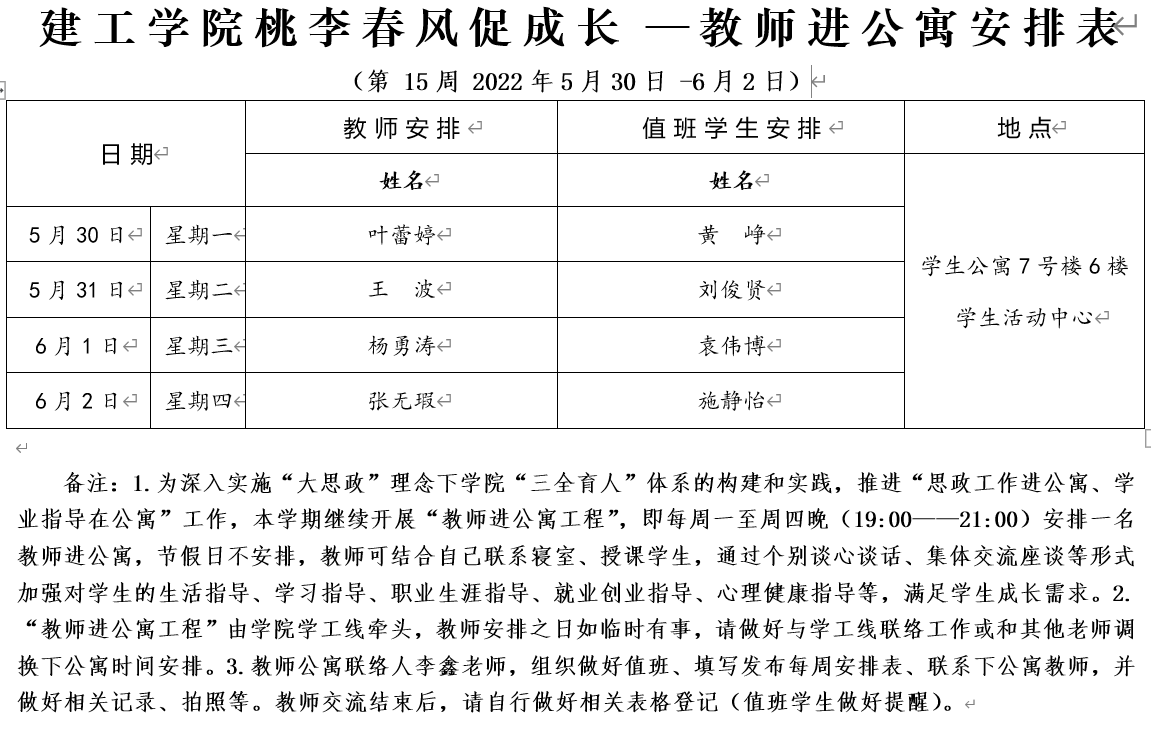 公司桃李春风促成长—教师进公寓安排表(第15周 2022年5月30日-6月2日)