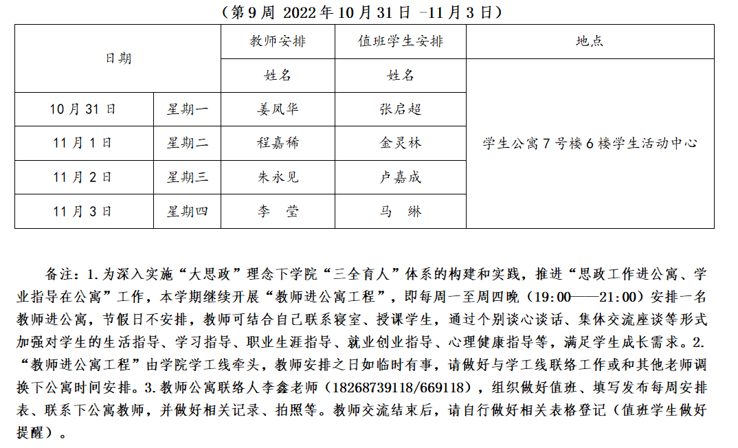 公司桃李春风促成长—教师进公寓安排表(第9周 2022年10月31日 -11月3日)