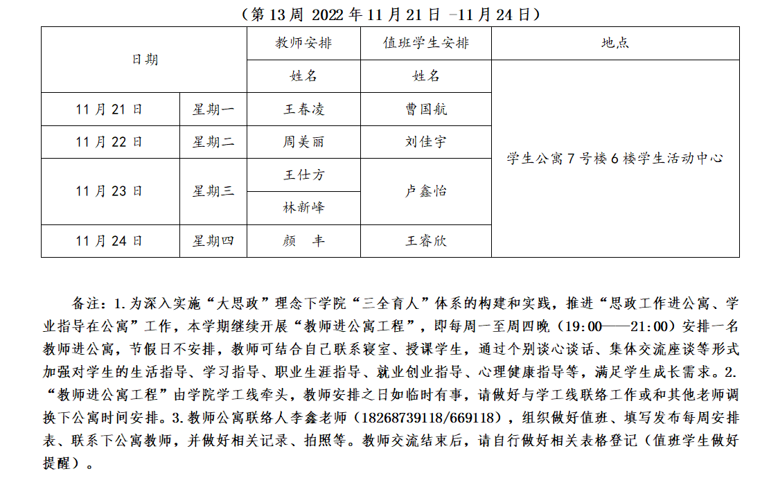 公司桃李春风促成长—教师进公寓安排表(第13周 2022年11月21日 -11月24日)