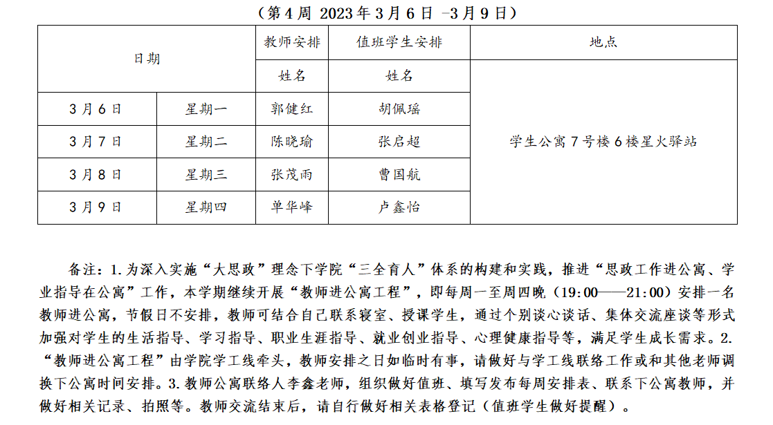 公司桃李春风促成长—教师进公寓安排表(第4周 2023年3月6日 -3月9日)
