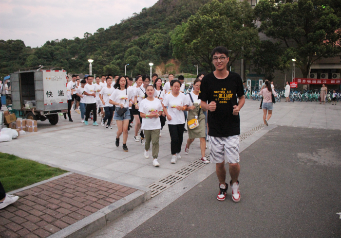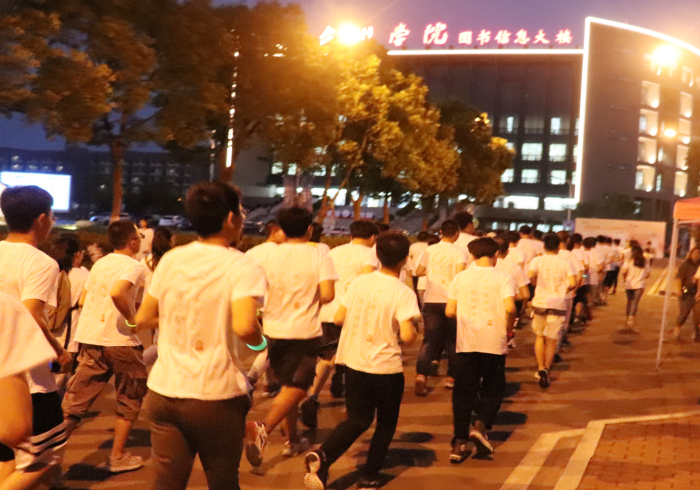 夜晚的台院星光点点,微风吹拂。285名新生身着彩虹T恤在团学干部的领跑下开始第一次校园荧光跑。手里的荧光棒在夜空中挥舞,一个个光影前后连缀,划出一道道美丽的弧线。夜跑队伍打卡教学楼、图书馆、水街、体育馆、操场,延着“阳光长跑”路线,伴着树叶沙沙声与加油口号声,整齐的队列流动成独特的风景线。到达终点合影留念后,同学们席地而坐,天南海北地畅谈,不时传来欢声笑语,夜晚的校园一派盎然生机。大家纷纷表示,“荧光跑”不仅帮助同学们熟悉了校园路线,增进了同学之间的友谊、感情,还能锻炼身体、增强体质,更让大家充分感受到了“无体育,不建工”的独特公司文化。