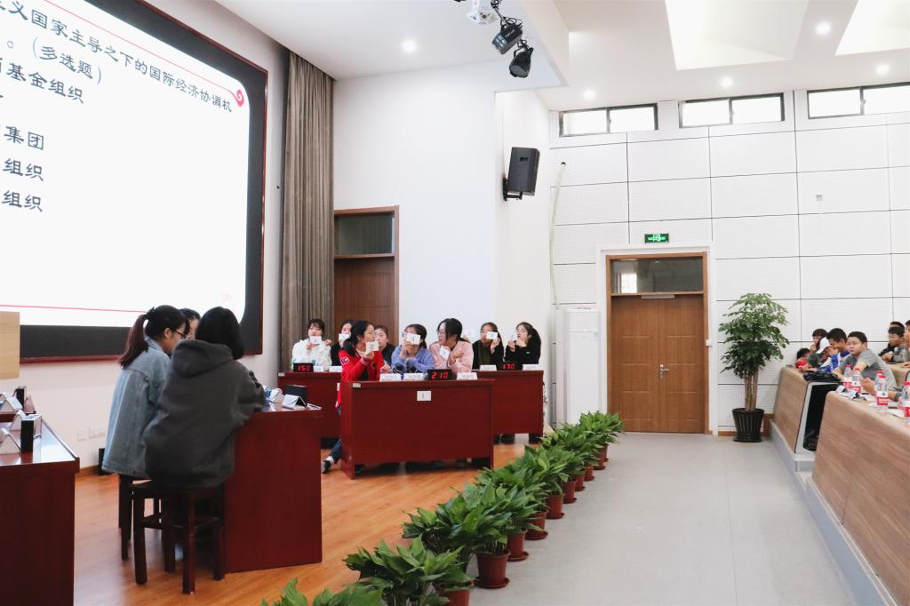 本次竞赛以“学习新思想,奋进新时代”为主题,为做好赛前的组织发动工作,通过线上线下两种宣传相结合,提前引导同学们进行模拟练习。经过初赛的笔试选拔和网络答题,共有六个小组脱颖而出进入决赛。场上,参赛选手们个个斗志昂扬、信心十足,必答题环节,选手们沉着答题,展现了扎实的理论功底;抢答题环节,大家积极作答,现场气氛紧张刺激;风险题环节,各小组你追我赶,场上比分不相上下。经过四轮的激烈比拼,最终,黄晨露、俞诗涵、肖亚珍团队以良好的理论素养和稳定的临场发挥,领先对手,夺得一等奖。