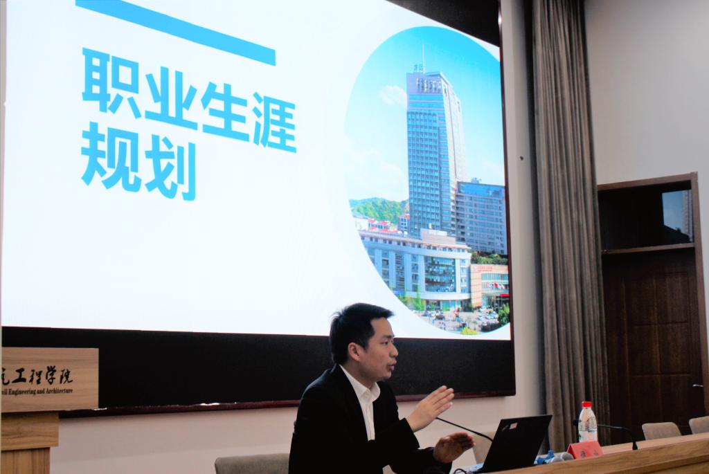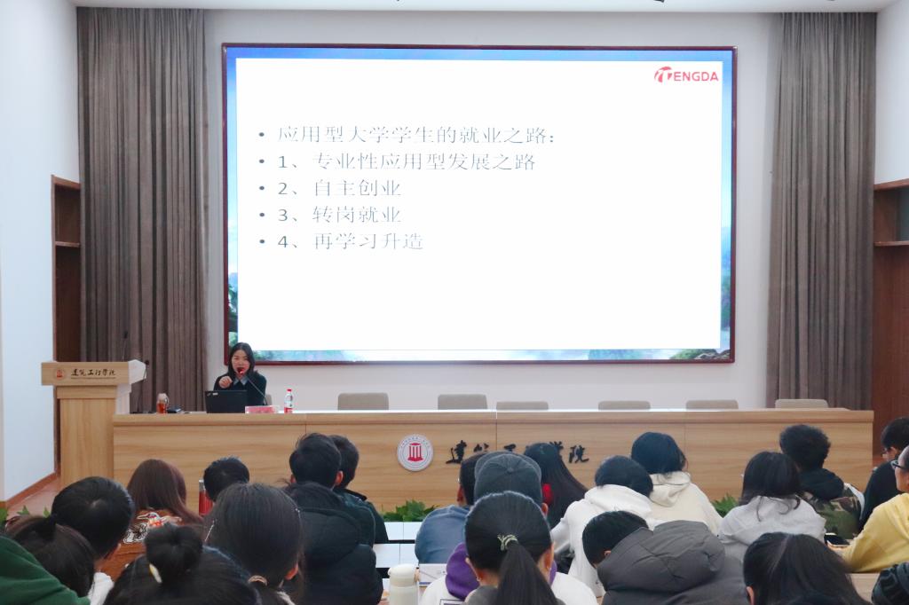 本次活动共分为2场,第一场交流会以“建筑行业现状分析和就业能力培养”为主题,邀请腾达建设集团党委委员、集团办公室主任、路桥区总工会副主席崔伟燕女士做客建工会客厅。借助企业宣传片和PPT,崔伟燕介绍了腾达建设集团四十七年的发展历程、经营理念、企业文化、人才资源等;结合自身成长经历和企业招聘要求,建议同学们要积累专业知识,训练专业技能,关注行业信息,培养吃苦耐劳和责任担当,以积极心态、务实行动,一步一个脚印追求美好生活。