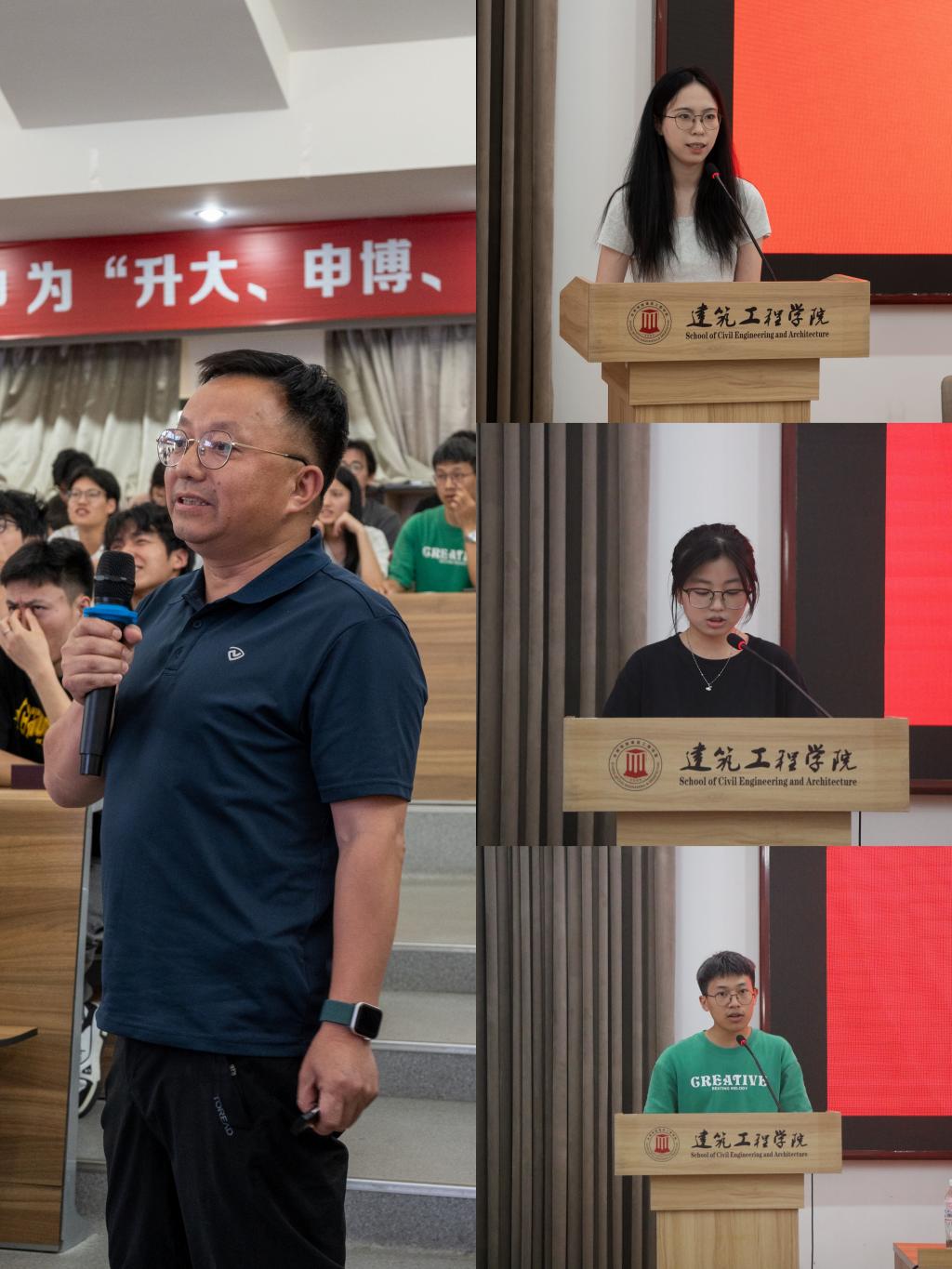 会上,21给排水徐莉霞、20建筑学李欣作为考研上岸员工代表发言,分享她们的考研历程,为2026届考研学子带来启发与力量。22道桥钟吉鹏作为备战考研员工代表发言,希望在更好的平台遇见更好的自己。班主任代表21土木中外2班柯云斌提出从班委组织选拔与管理、班级文化建设、员工心理疏导与后进生管理三方面入手,分享班级建设和管理经验。