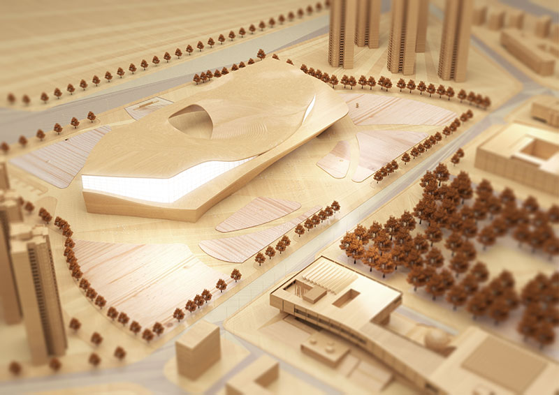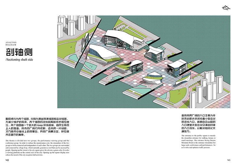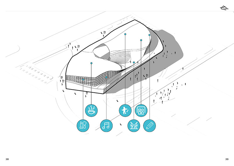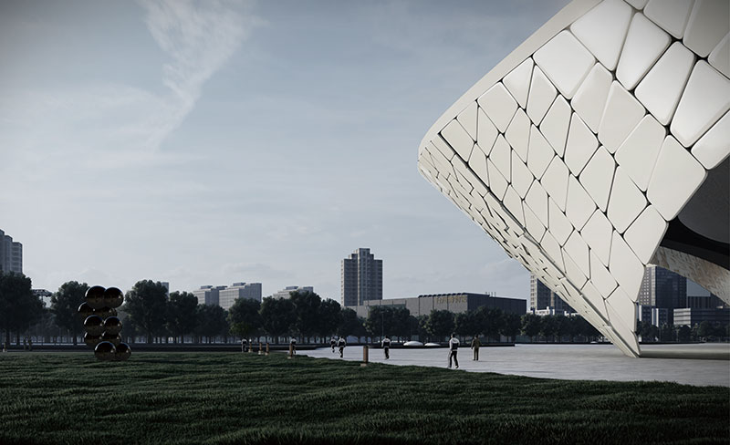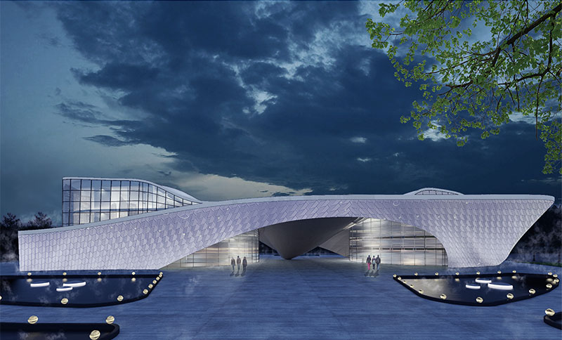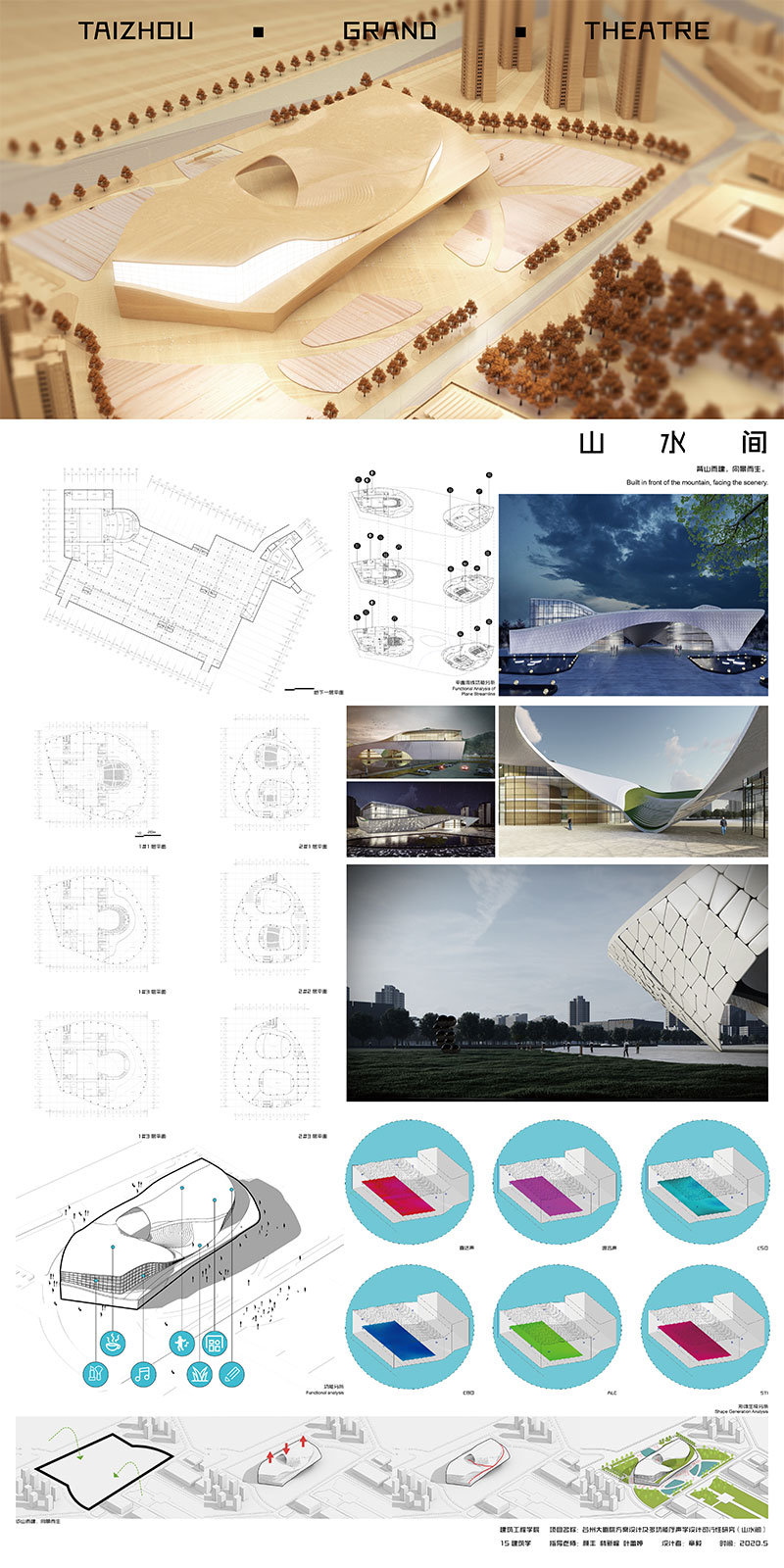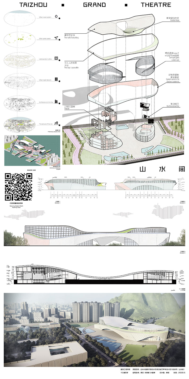 项目位于台州市椒江区,背靠白云山。位于以白云山和乌龟山为端点的城市主轴上。建筑巍然而立,气势自成。台州大剧院由大剧院和音乐会议厅两座功能型建筑联体构成,特殊的形式语言,以及与外界联系密切的功能定位,使其自然的承担起这景观中轴上的重要职责。建筑的设计概念用两个字概括:曰“纹”,曰“势”。山有山势,地有地势,水有水势,项目顺山景之势,以流动之感,与山水之间,势动而乐起,听者自来。