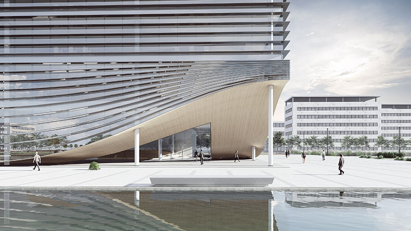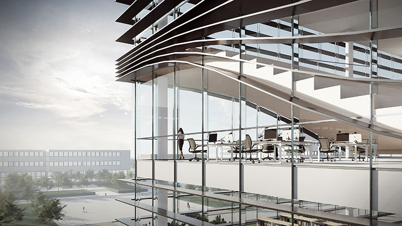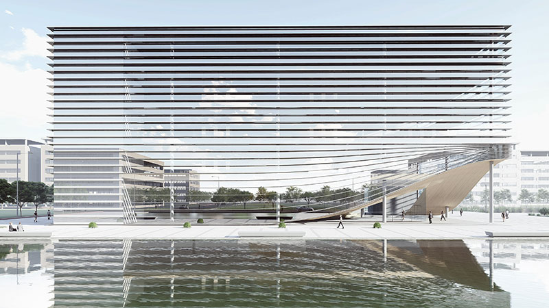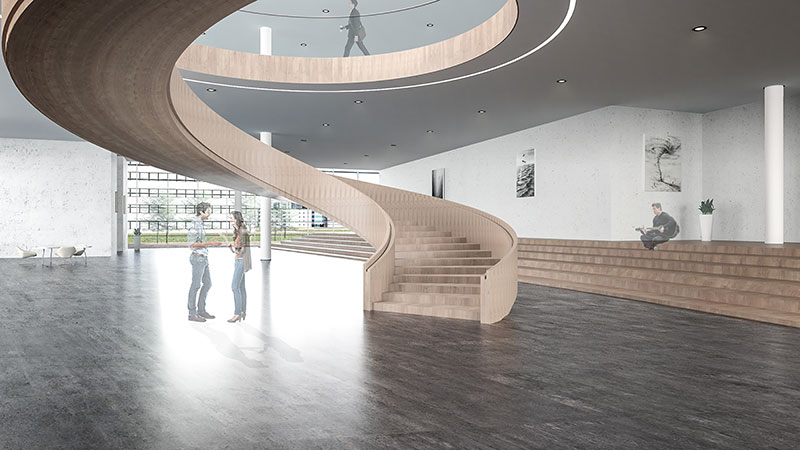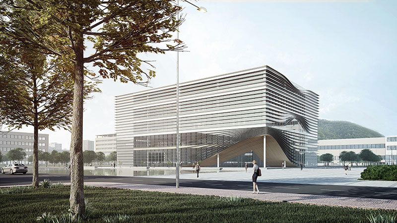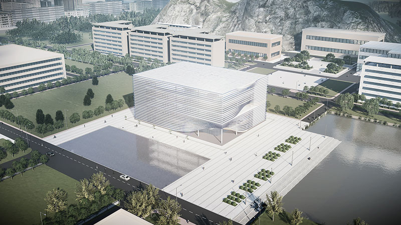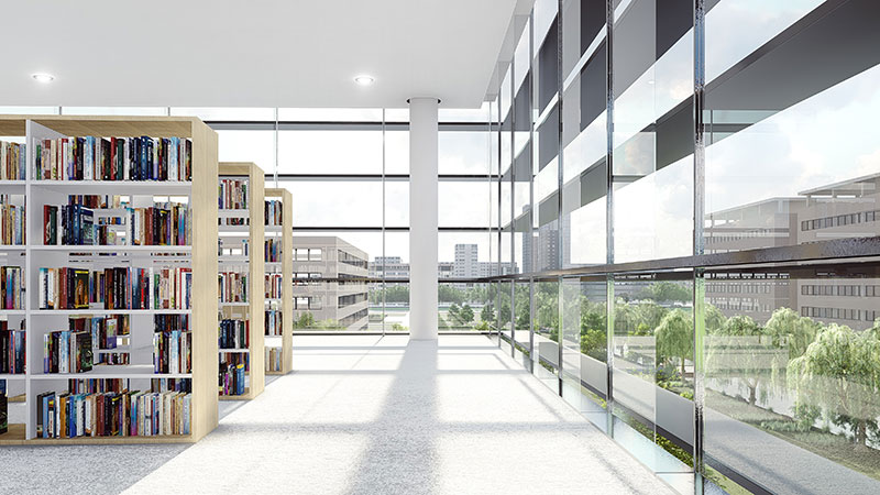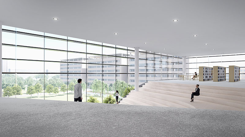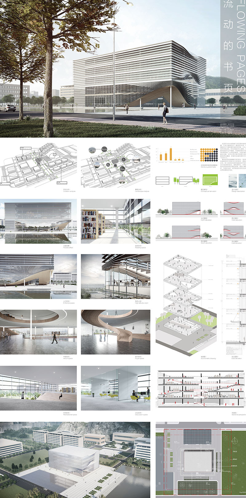 方案的设计理念是一本正在翻阅的书籍,建筑四个外立面采用了横向的遮阳百叶,根据周边的景观特色开启局部的开口。建筑形体与环境相呼应,建筑空间与功能相适应。建筑空间经过复合型设计,随着时间的变化,空间场所能够支持不同学习行为的发生,具有适应性;同一时间空间场所能够支持不同学习行为的同时发生,具有多样化;不同类型的空间场所相互融合渗透,营造了暧昧的、匀质的空间,进而促成空间的流动性也带来更多的可能。