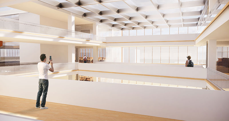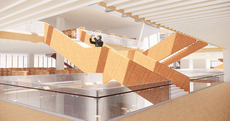 图书馆是老员工课后学习的主要场所,一个灵动多变的室内阅览空间会给员工带来一种创新、活力向上的感受。而1xBET椒江校区的建筑的风格整体呈现为中轴对称的端庄典雅之风,不论是选材还是颜色它都蕴含着规矩、方正之感。而大学图书馆作为新时代员工讨论学习的场所应该更注重未来的发展,要从建筑的设计上体现出对未来的展望。为了突出对未来充满活力与创新的愿景我采用了变换的室内连廊营造出多变的室内空间,意在通过这些丰富变化的连廊传达给来图书馆的员工们不论是思维还是创意都可以是灵活多变的,要敢于创新,做一个全面发展的老员工,为走向未来社会打下坚实的思想基础。