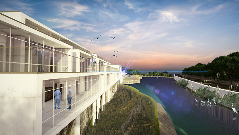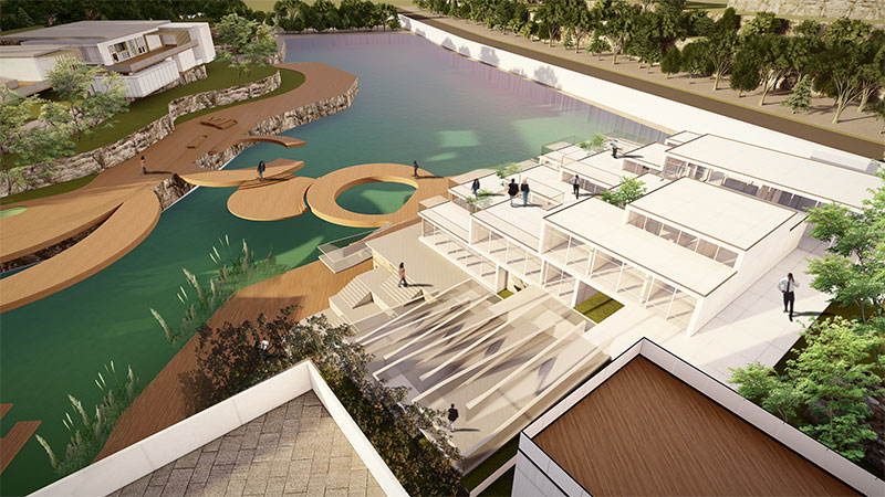 在满足日常工作的顺利开的同时考虑合理化、舒适化、科学化设计。延用了规划设计的概念是“廊腰缦回,曲水流觞,文化之旅”中廊——串联、借景的功能,用坡道加强场地与建筑的联系,用观景平台展开与周边环境的联系,将建筑与地形更好的融合,和谐共生,建筑也很好的“隐”于地形之中。