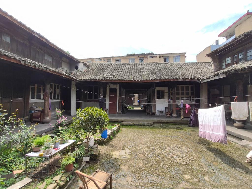 前院外围是一圈檐廊,东西有两座倒座房,穿过过厅是一个二层的四合院,近百平米铺地由黑白色鹅卵石构成蝙蝠等复杂花纹,寓意祝福。