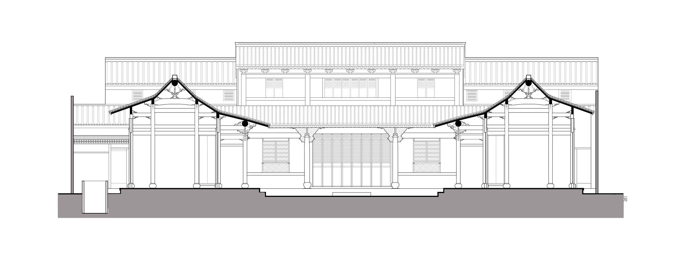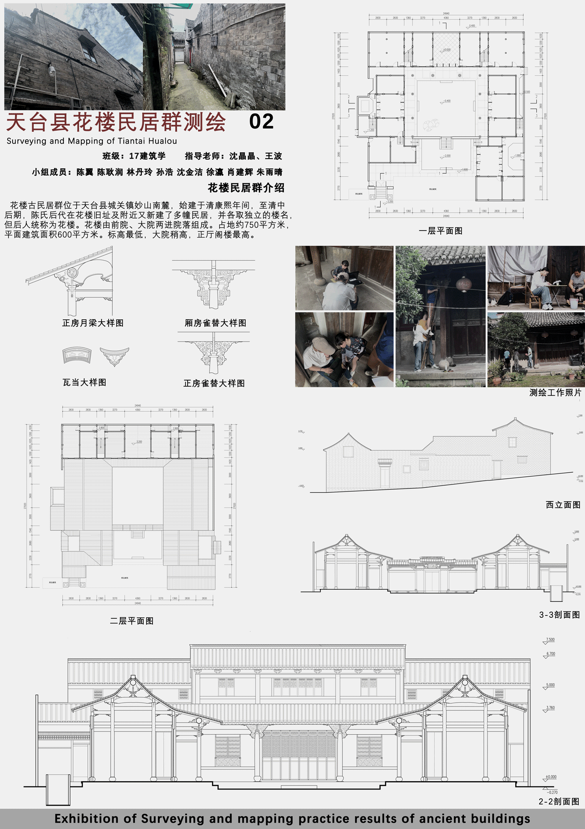 花楼占地约750平方米,平面建筑面积600平方米,由前院、大院两进院落组成。建筑依妙山而建,层层递进,对称布置。前院标高最低,大院稍高,正厅阁楼最高。两层高差的房屋交接处顺势做了两间半地下室,作贮物之用,充分利用了山地的地形。