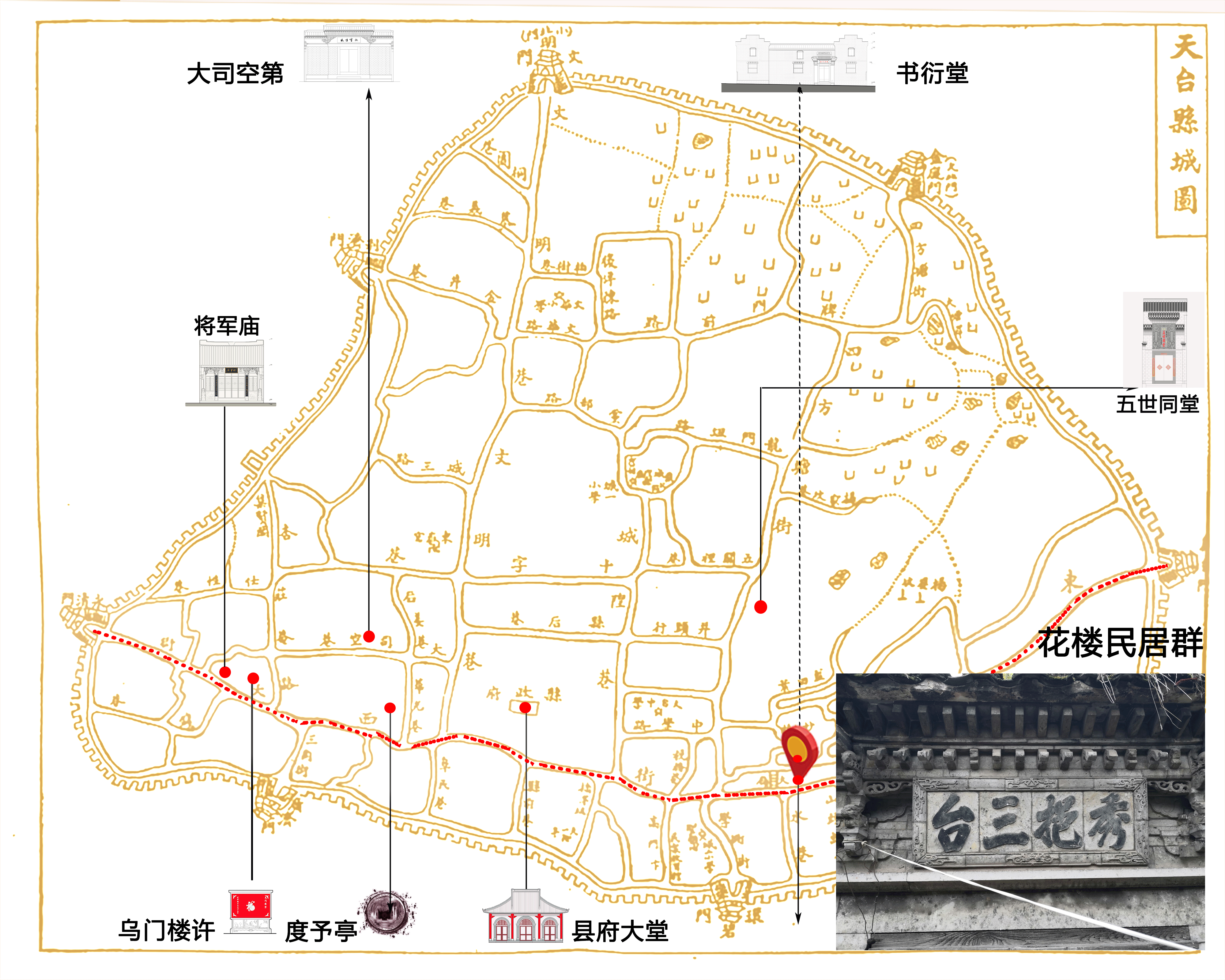 花楼民居群在城关镇中山东路,妙山南麓。清康熙年间,陈氏在此建宅,称花楼,年久渐圮。至清代中后期,其后裔在原址重建多处独立的四合院民居,皆统称花楼。现存花楼民居群包括亚魁第、进士第、新花楼等。