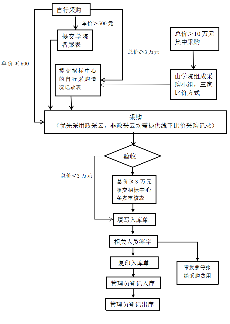 3. 自行采购总价≥3万元的耗材,需要提交自行采购情况记录表。采购完成验收后,需提交自行采购材料备案表(需上传签字盖章版合同扫描件)。经仓库管理员核实入库单后,经分管领导签字后到计划财务处报销。