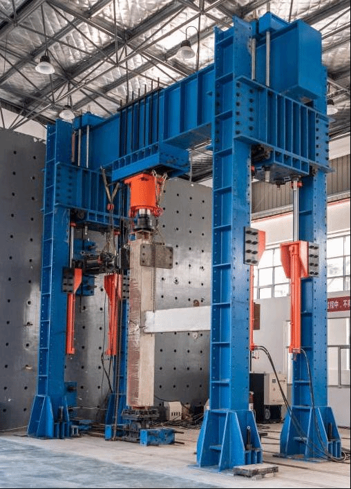 3、5000kN长柱试验系统(附图):该系统采用自反力四丝杠框架结构;500吨电液伺服拉压作动器安装在横梁上(油缸上置),并可以上下调整以改变试验空间;可实时控制试验进程、显示和存储试验力及作动器位移,绘制试验曲线。可开展实验项目:多通道协调加载下的长柱压缩或拉伸试验及梁、板的弯曲试验。