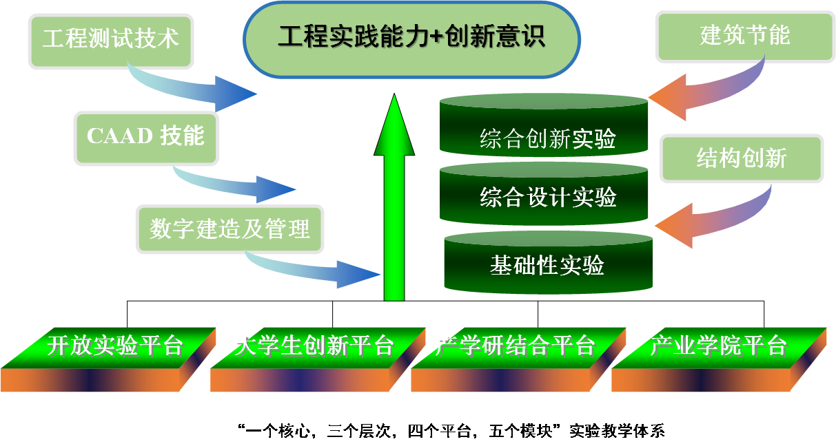建筑工程实验教学示范中心,下设土木、交通、市政、建筑四个建制实验室,有土木工程材料、岩土工程、建筑给排水、工程测量、结构虚拟仿真分室等14个实验分室。实验室总面积4490平方米,设备总值3000万左右,大型仪器设备25套。实验中心依托土木工程、道路桥梁及渡河工程省一流专业,结合土木工程、防灾减灾工程及防护工程重点学科优势,目前已形成建筑结构与智能建造;交通基础设施及耐久性;岩土工程灾变与防治)3个区域特色鲜明的学科方向。